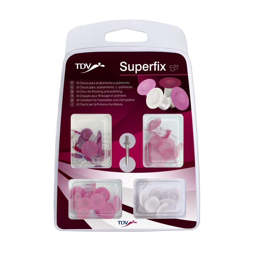 El sistema Superfix para acabamiento y pulimento de restauraciones con resinas compuestas está conformado por discos de lija con soporte flexible y el mandril Versaplus. Los discos se presentan en diámetros de 9,5 mm y 12,7 mm y en cuatro granulaciones codificadas por colores, lo que facilita su selección. No posee centro metálico como los discos de lija convencionales lo que permite el aprovechamiento total de la superficie abrasiva del disco sin que exista el riesgo de dañar las piezas dentales.