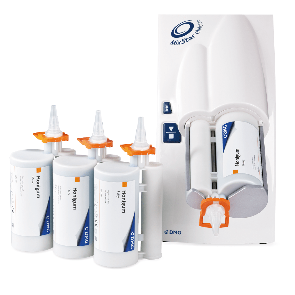 • Honigum Pro Mono – Material de impresión Monofásico en VPS. Disponible en caja de 5 cartuchos de 380 mL con 50 puntas.