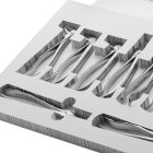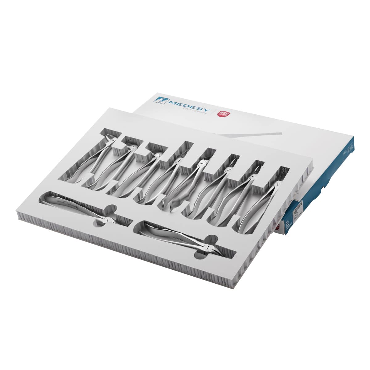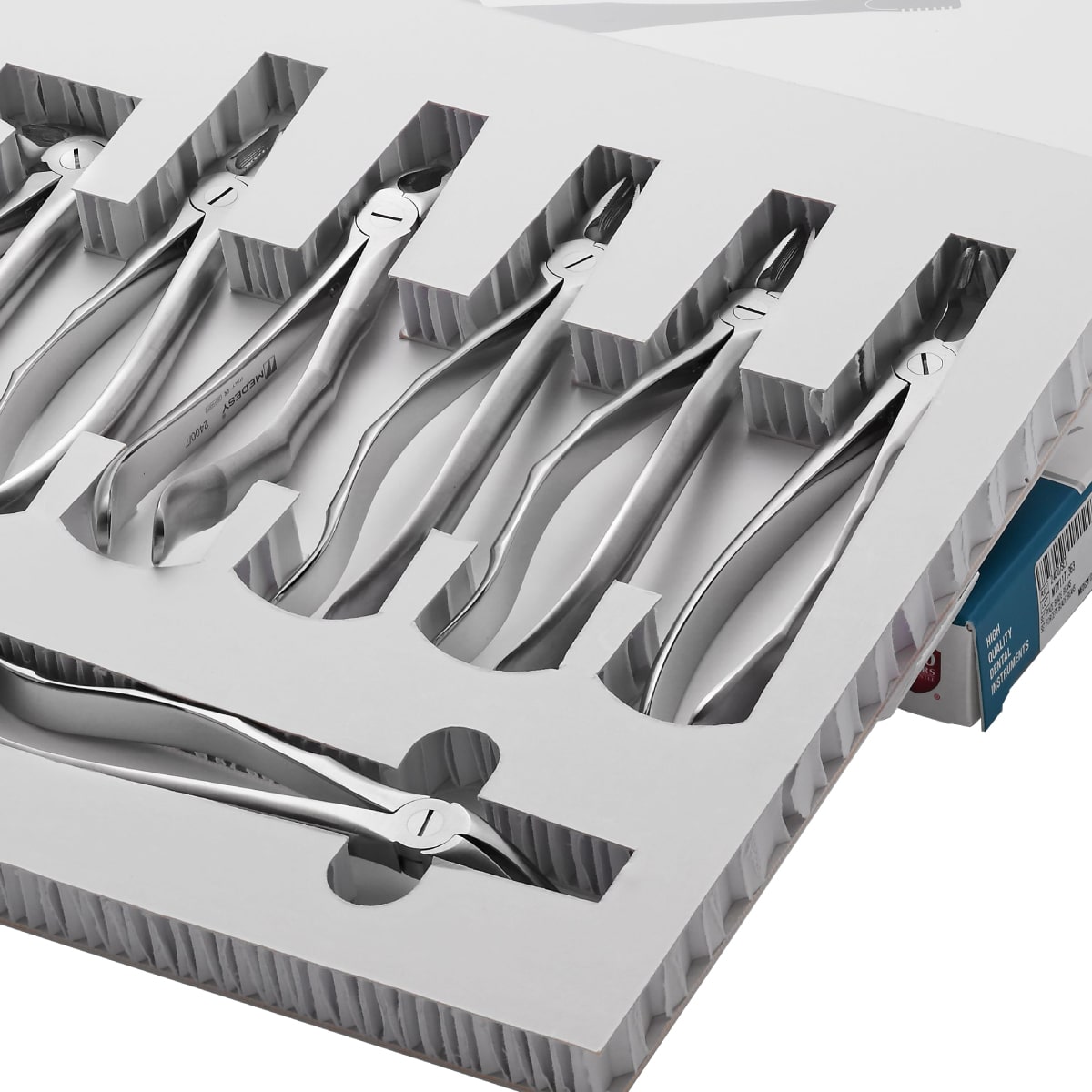 Toda la gama está fabricada con acero inox seleccionado de alta calidad con satinado superficial, cada modelo está rematado uno a uno por nuestros artesanos manualmente, el extremo de trabajo es tan perfectamente liso y achaflanado que garantiza un mayor respeto de los tejidos y reduce la fractura del diente a extraer. Las puntas de los fórceps de esta línea Blade Beaks son menos voluminosas que los modelos tradicionales y logran penetrar fácilmente hasta la zona radicular.
