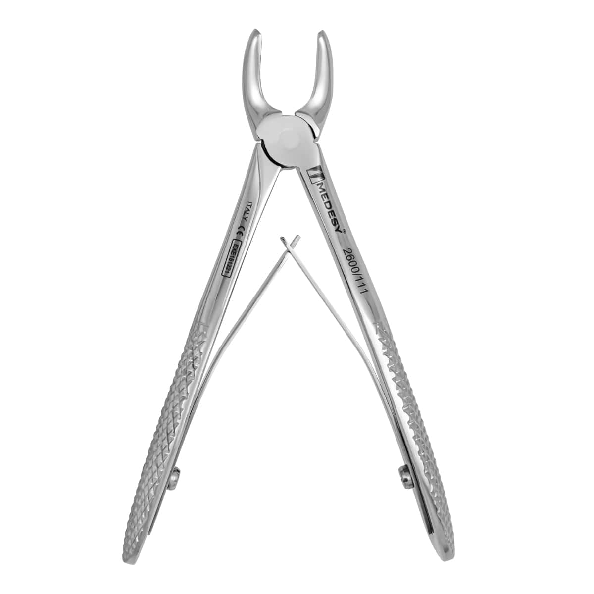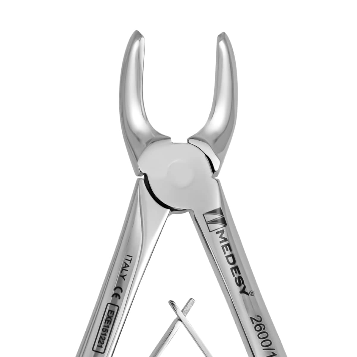 Nuestros fórceps pediátricos de la línea 2600 son más pequeños que los fórceps normales para extracciones en adultos. Están diseñados a propósito para que el dentista pueda esconderlos en el interior de la palma de la mano para que la experiencia sea menos traumática para los pacientes más pequeños. La línea 2600 está compuesta por fórceps dotados de un sistema con muelle muy práctico y funcional para agilizar al máximo los tiempos de la intervención.