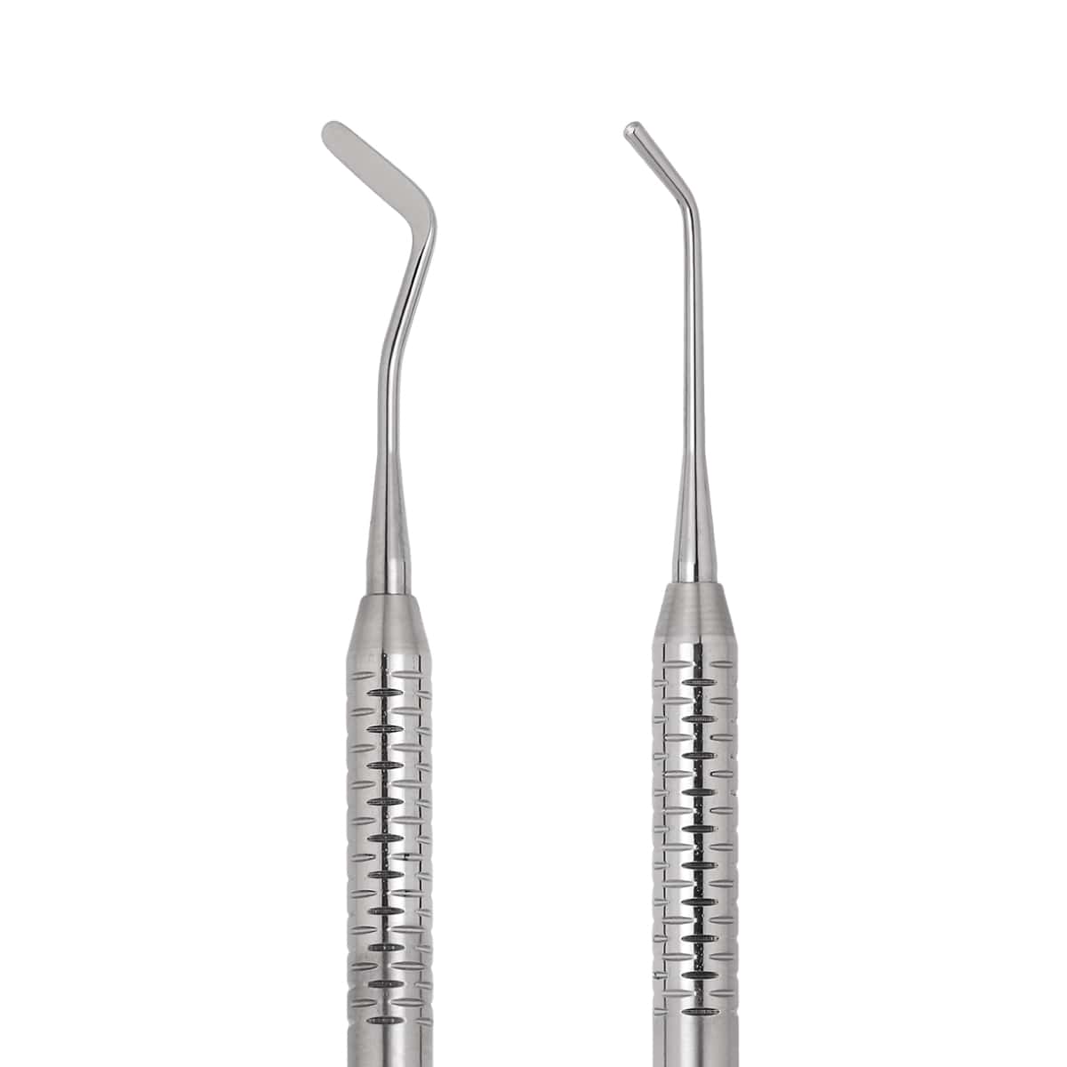 Los instrumentos para composite Goldstein se caracterizan por sus puntas finas y pequeñas. Son instrumentos con doble extremo que combinan una espátula para composite por un lado y un obturador o una miniespátula por el otro.