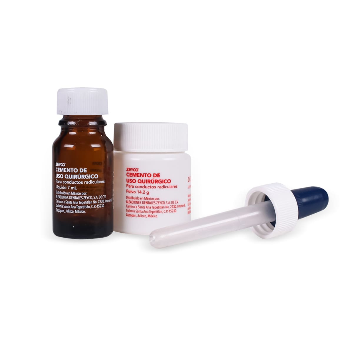 Cemento de Uso Quirúrgico Zeyco está formulado a base de óxido de zinc y eugenol. Ideal para el sellado de los conductos radiculares en el tratamiento endodóntico. Se utiliza para rellenar las irregularidades y discrepancias que existen entre el material de obturación y las paredes del conducto logrando así un sellado hermético.