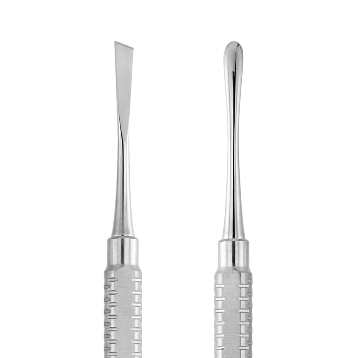 Nuestro modelo de elevador de periostio 24G está compuesto por dos hojas del mismo tamaño, 4 mm. Una tiene forma triangular con el borde afilado y la otra es redondeada pero bien afilada. Ambas puntas soldadas al mango con precisión están achaflanadas en el lado no previsto al levantamiento de los contornos del tejido para garantizar la máxima comodidad al paciente.