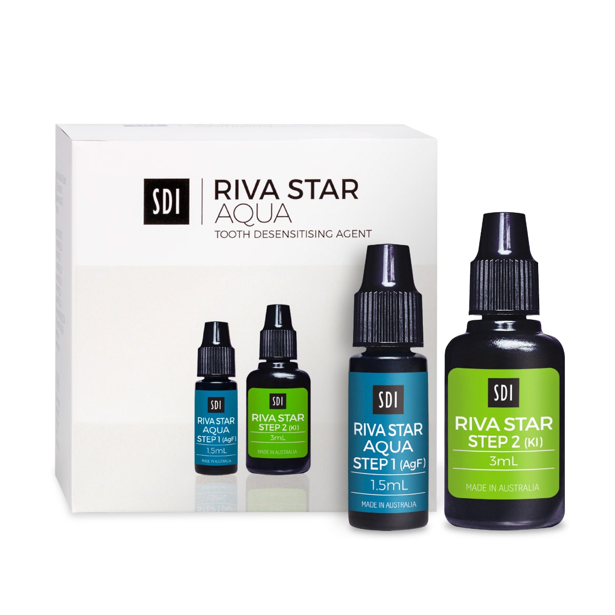 Al igual que Riva Star (FDP), Riva Star Aqua (AgF) es un sistema patentado de 2 pasos no invasivo indicado como cariostático y desensibilizante dental.